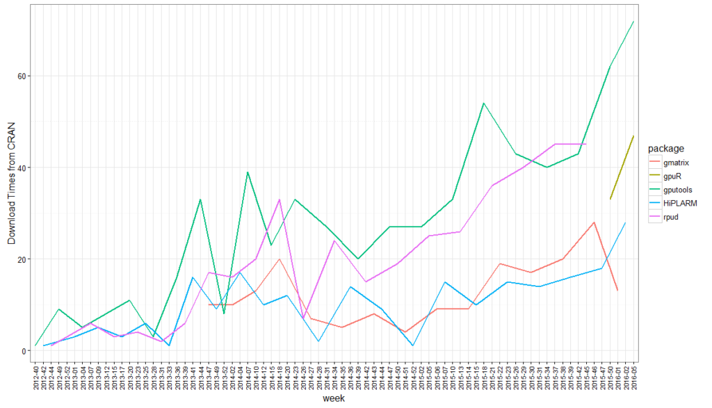 In the previous post (here), we have analyzed the performance gain of R in the heterogeneous system by accelerators, including NVIDIA GPU and Intel Xeon Phi. Furthermore, GPU accelerated packages can greatly improve the performance of R. Figure 1 shows the download statistics of CRAN over the years. Obviously, GPU is more and more recognized by the R community.