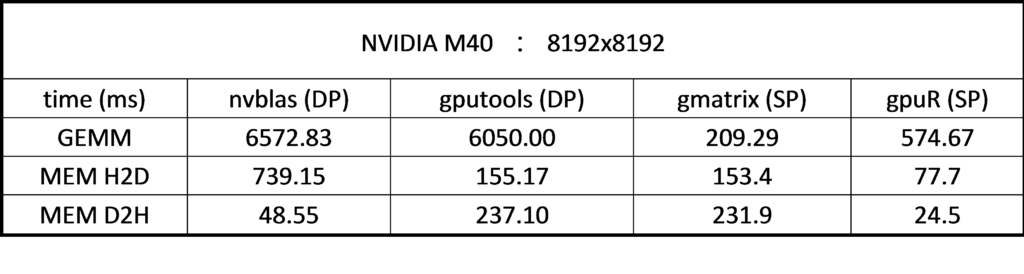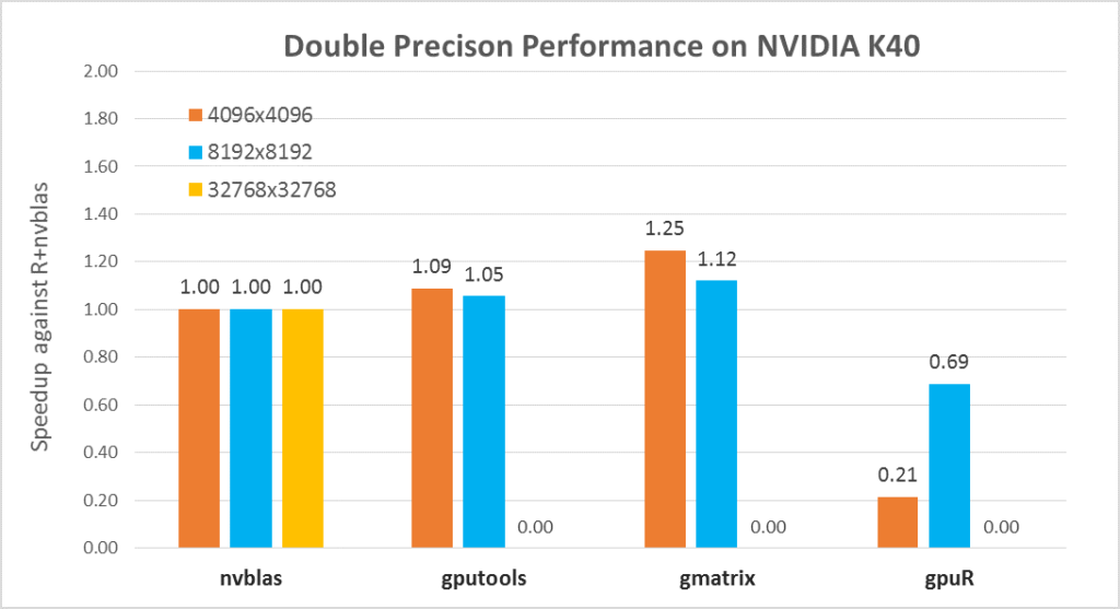 Double-precision (DP) is used in nvBLAS and gputools to align with the default double precision mode of R. On the other hand, gmatrix and GPU can be more flexible for the user to choice single-precision (SP) or double-precision (DP) in the computations. And even gmatrix can support integer matrix computing. The SP computation mode can significant leverage the capability in low-mid level NVIDIA GPU cards, such as Tesla M40 and Geforce series GPUs, where the main computing power from SP floating-point operations. Therefore, this is a good news common desktop GPU users.