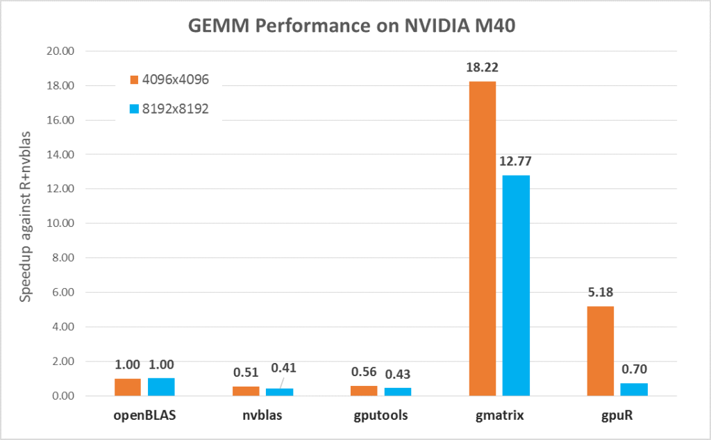 Single precision is quite important for data scientists but openBLAS, nvblas, and gputools use default double-precision (DP) calculation mode of R. So, it will lack competition in some hardware such as Tesla M40 where the DP performance is only 0.2T. In this parts, we will show you how to leverage SP performance in R by gmatrix and gpuR. In the blow testing, we take openBLAS performance results as the baseline. *R code of gmatrix and gpuR with SP calculation mode