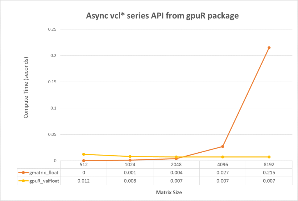 For the advanced user, gpuR provides a set of asynchronous mode interface. By using asynchronous interfaces, the R program will immediately return to the CPU program side after calling the interface of vcl *, and the user can continue to perform other tasks on the CPU. When the user explicitly accesses and use vcl * data, if the calculation has not yet completed, R will continue to wait; if the calculation has been completed, users can directly use. Therefore, users can use concurrency of CPU and GPU to hide the communication and computing time on GPU. In Figure 4, we compared the computing time between gpuR in asynchronous mode and gmatrix in synchronous mode (gmatrix shows the best performance in synchronous mode testing). As figure 4 shown, the sync-API execution time increases as the computational task increases but async-API keep a very tiny cost for all input size because the async-API do not include any actual calculations and just returns immediately. So, in the best case, we can hide all GPU execution time with CPU computation with a very tiny overhead. *gpuR running code with SP in asynchronous mode