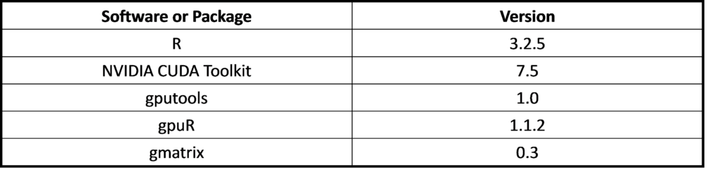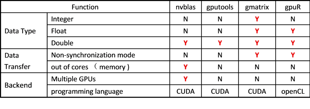 Matrix operation (BLAS) is one of the most important operations in data analysis, such as co-matrices in recommended systems and convolution calculations in deep learning. The matrix and the vector multiplication and other standard operations in R can be accelerated by GPU significantly. The most simple way to use GPU in R is through the nvBLAS (cuBLAS) library provided by NVIDIA, but other GPU accelerated packages (gputools, gmatrix, gpuR) provides a richer software and hardware interface, as shown in Table 1.