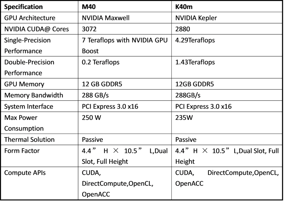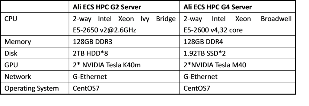 The test is performed on the Ali cloud HPC platform: G2 server with NVIDIA Tesla K40m, G4 server with Tesla M40. Ali cloud HPC provides independent physical server + GPU accelerator card without virtualization overhead for computing-intensive applications. Regarding GPU equipment, K40m is designed with Kepler architecture while M40 with Maxwell architecture. The M40 targets for deep learning markets especially for training. Its SP floating-point peak performance reaches 7TFlops, but DP is only 0.2TFlops.