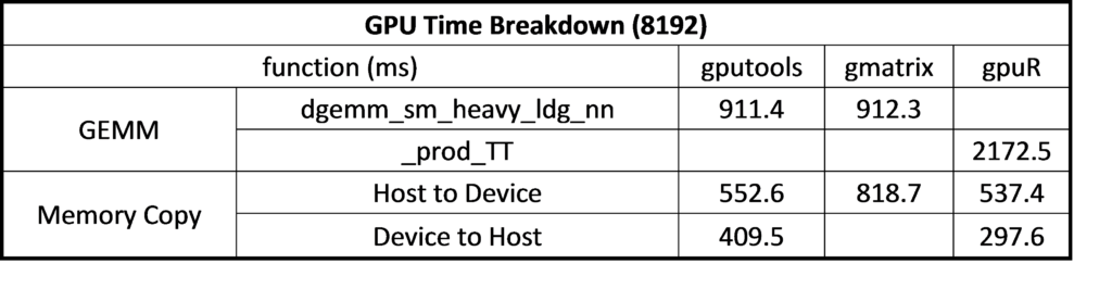 For gmatrix, matrix (A, B, C for C = A*B) are copied to GPU and C matrix stored in the GPU side after the calculation, involving three times host-to-device data transfer and without device-to-host transfer. For gputools matrix (A, B) are copied to GPU, the result matrix ( C ) is copied back to the host side so totally twice host-to-device and once device-to-host data transfer. Because the host-to-device data transfer is faster than device-to-host, gmatrix could get better performance than gputools as table 6 shown. Finally, we take a look at gpuR performance. The matrix calculation leverages OpenCL API that the performance is less optimized on NVIDIA GPU in table 6. GEMM compute kernel _prod_TT is much slower than gputools and gmatrix. Take 8192 for example, the calculation time of cublas API is 911.4 ms and 912.3 ms for gputools and gmatrix while OpenCL is 2172.5 ms for gpuR.