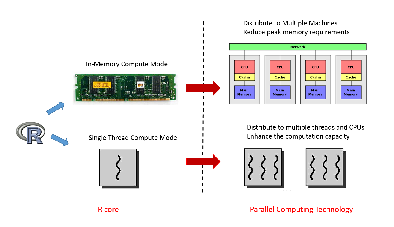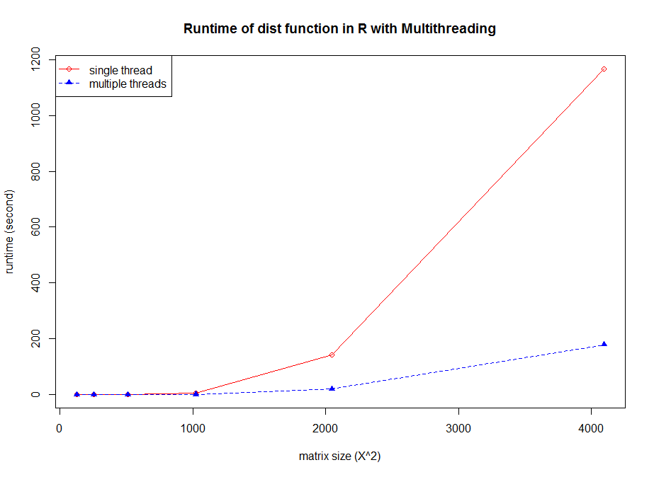 When using the GPU as a coprocessor to speed up the application, the cost of data transfer usually takes a significant portion of the time, and the size of the GPU’s built-in memory will also limit whether the application can be executed. One of the main advantages of nvBLAS is that it supports block-based data copy and calculations between CPU and GPU, so the memory required from R code can be large than built-in GPU memory. However, the host-to-device memory copy, the calculation, and the final device-to-host results are performed in a synchronized mode so that the user cannot isolate the data transfer and calculation in nvBLAS. gmatrix and gpuR provide the asynchronous mode of communication and calculation, the user can separate the data copy and the real calculation. For example, gpuR provided in the vcl * series API, it will return in the R console immediately and then R will execute the next CPU command, while GPU is computing. In this way, both CPU and GPU are working simultaneously. And we can get much more performance boost.